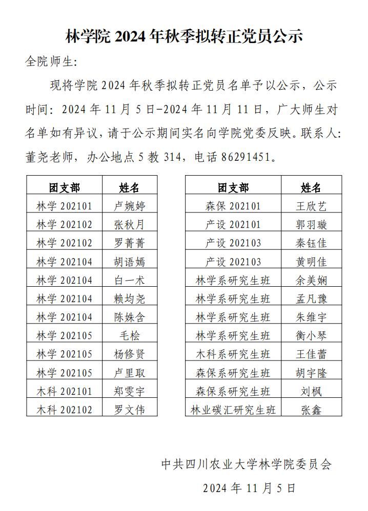 林学院2024年秋季拟转正党员名单公示