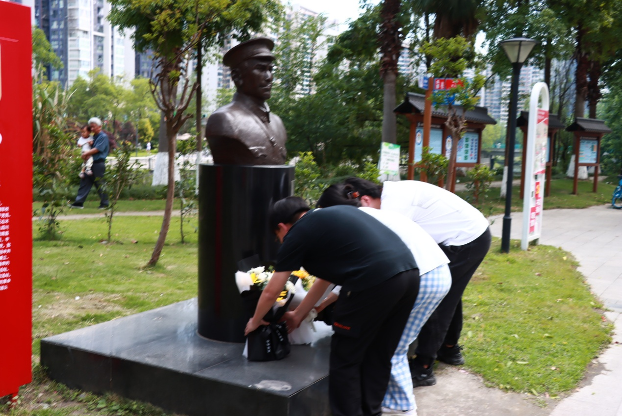 之后,全体人员前往位于温江区涌泉街道江浦路社区亚洲湾广场的康明惠烈士纪念碑,大家着装整齐,心情严肃,首先对铜像进行了清洁,然后献上鲜花,集体鞠躬默哀,表达对革命烈士的深切缅怀和崇高敬意。全体同志在活动横幅上签字,表达出自己对共产主义的坚定信仰,以及决心用科研报国、兴中华之农事的理想信念。