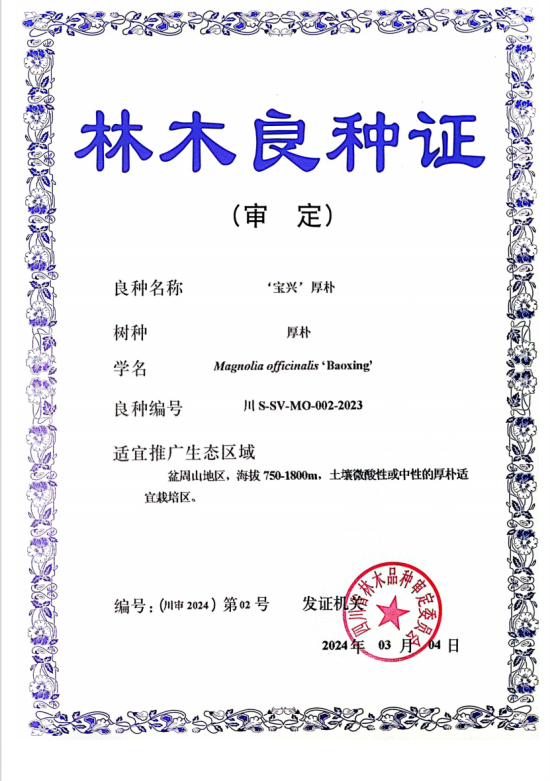 近日,四川省林业和草原局发布公告(2023年第24号),由林学院国家林业草原红豆杉西南工程技术研究中心选育的药用林木新品种“宝兴”厚朴和“川荥”川黄柏通过审定。其中“宝兴”厚朴品种特性为叶大型,新鲜单株树皮产量可达10千克,厚朴酚与和厚朴酚含量高达4.6%-9.2%。“川荥”川黄柏新鲜单株树皮产量可达25千克,盐酸小檗碱含量高达6.0%。两个新品种均具有一定耐干旱特性,较强的抗病虫害能力。
