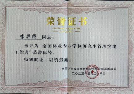 会上,教指委对17名全国林业专业研究生管理突出工作者进行了表彰,学院研究生教育教学管理专职秘书李羿桥获得该荣誉称号。