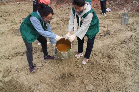 在胡迅的带领下,参加活动的师生分工合作,干的热火朝天,挖坑、扶苗、回填、提苗、围堰、浇水,在一片荒地上种上了寓意学校建校117周年的117棵树苗。