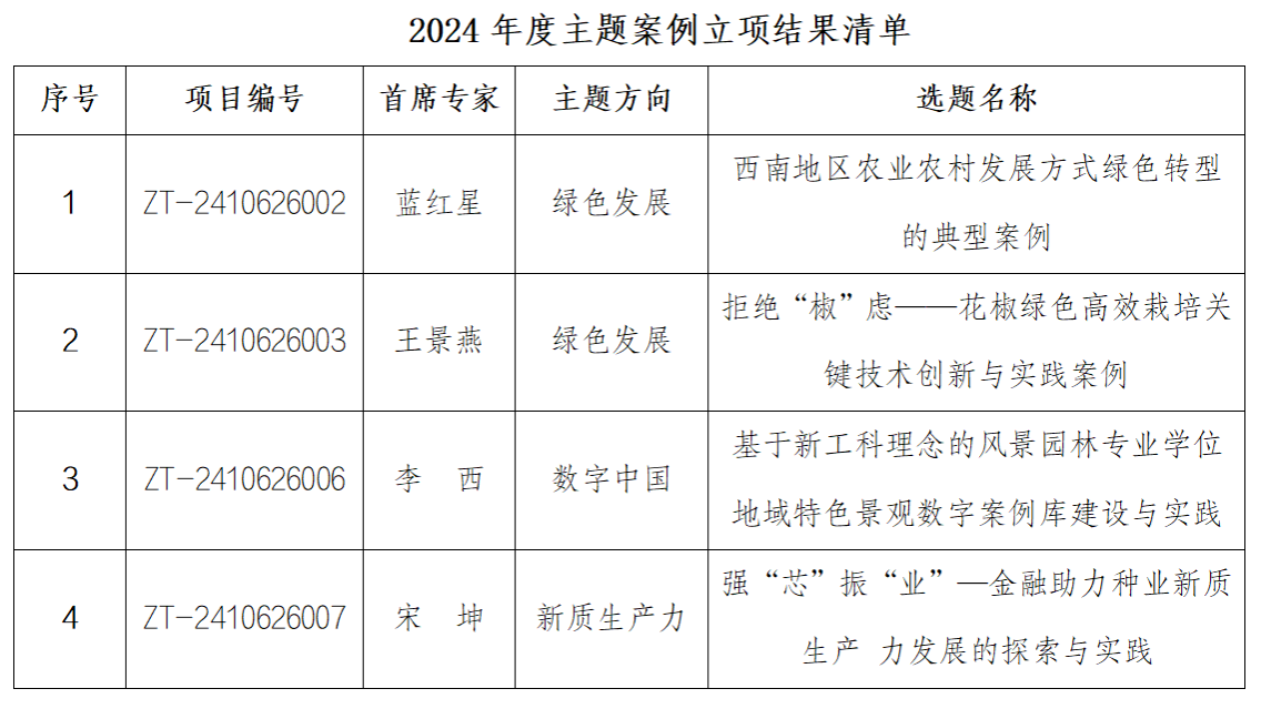 日前,教育部学位与研究生教育发展中心公布了2024年度主题案例立项结果。本次主题案例征集围绕“绿色发展”“新质生产力”“健康中国”“数字中国”四个主题展开,经过“单位审核推荐”“专家分组评议”“案例专家委审核”三级评审确定立项名单。学院王景燕教授作为首席专家申报的项目获批立项。