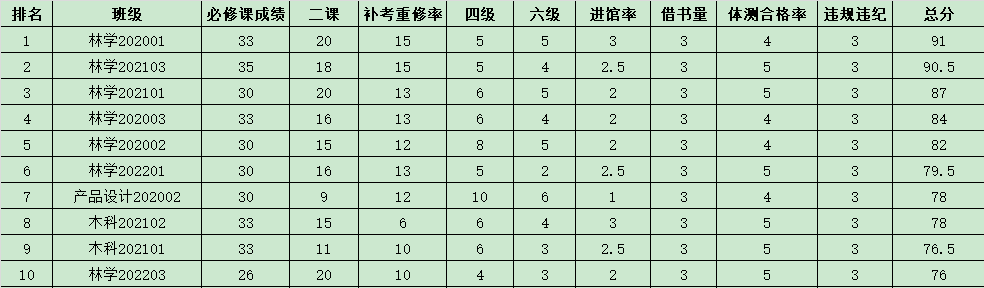 根据《林学院学风建设优秀小班积分细则》计算各小班的学风状态积分(小班不需提供材料)。积分第1-2名的小班直接获评学风建设优秀小班,第3至10名的小班可自愿申请参加评选答辩,答辩内容为班级在提升学风状态、班级凝聚力及活力等方面的方法及成效,包括但不限于《林学院学风建设优秀小班积分细则》里的几个方面。