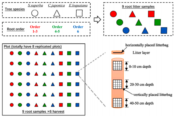 不同的空间位置为根系分解提供了区别于地上凋落物的不同的外部条件,而物种和根序则导致根系基质质量的明显差异。内部和外部条件的差异都可能决定根系的分解速率。为了探讨分解位置、根序和物种差异对根系分解的影响,并确定锰(Mn)在根系分解中的作用,在亚热带森林中的凋落物层以及0−10cm、20−30cm和40−50cm土壤深度处,研究了三个树种根系(分为1−3、4−5和6级根)的分解实验。在两年的分解过程中,测量了根的质量和C、N、P、Mn、缩合单宁和总酚的浓度。