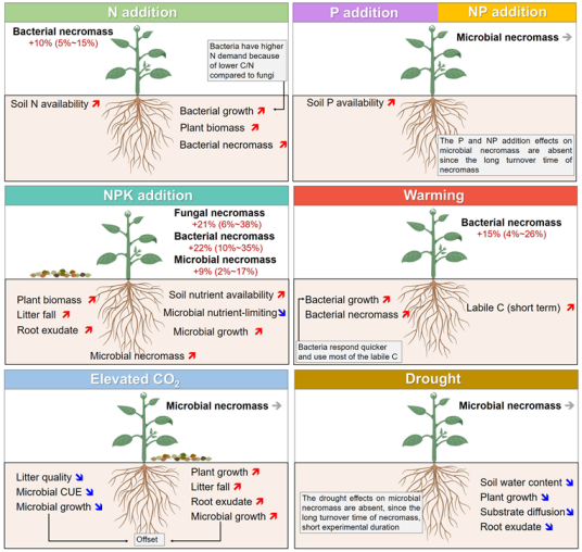 微生物残体作为稳定土壤有机质的重要组分,在目前多种全球变化背景下(升温,二氧化碳浓度升高,干旱,养分添加等),厘清微生物残体的动态对于了解碳循环过程和缓解气候变化具有重要意义。林学院黄从德教授团队利用全球相关数据,探究微生物残体对上述不同全球变化因子的响应,以及其过程对土壤有机质的影响。研究结果揭示了各全球变化因子对微生物残体的不同影响:升温仅增加了细菌残体含量,对真菌和整体微生物残体含量作用较小;与单一养分添加(单独氮和磷添加)相比,多种养分添加(氮磷钾共同添加)能有效刺激微生物残体积累,进而促进土壤有机质的形成。研究强调了在农田或草地等人为干预较强的生态系统中,适量保持多种养分的有效性不仅提高地上植被的生长,还能促进土壤微生物残体以及有机质的形成,在一定程度上有利于碳和养分的储存,进而有助于缓解由过量温室气体所引起的全球变暖。