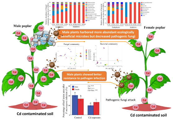 近日,植物学领域一区Top期刊《Journal of Experimental Botany》(最新IF=7.378)在线发表题为《土壤镉污染对雌雄杨树叶际微生物及相关抗病性的差异性影响》(Soil cadmium stress affects the phyllosphere microbiome and associated pathogen resistance differently in male and female poplars)的论文,标志着学院在镉污染影响雌雄杨树抗病性的研究中取得新进展。