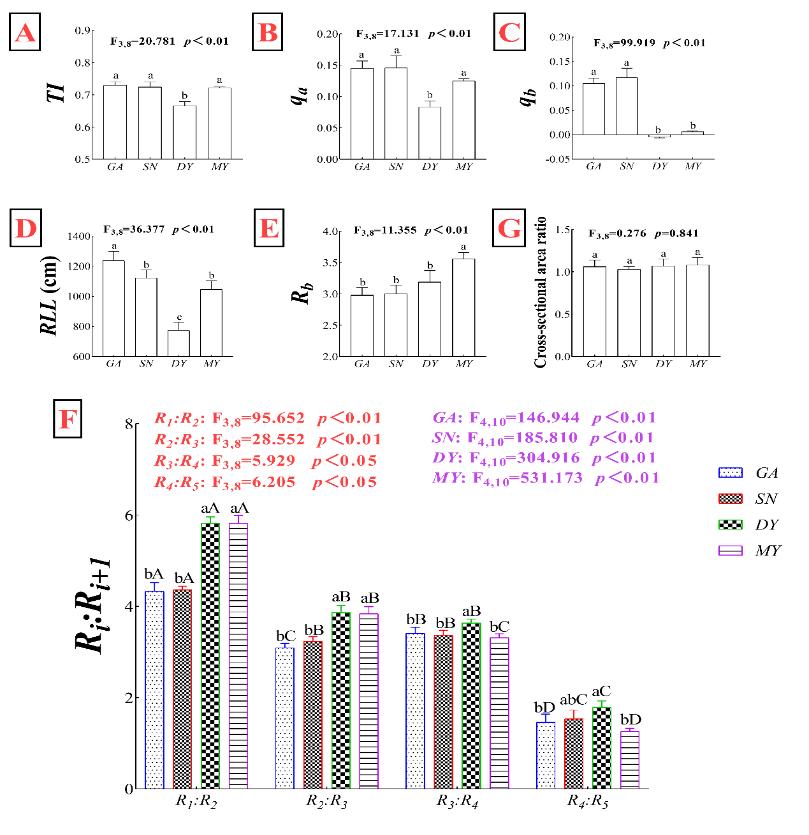 根系构型作为重要的一种根系经济谱,描述了根系在土壤中的空间排列顺序和位置,决定了植物对土壤中水分和养分的探索。根系的可塑性对植物适应环境具有重要作用。一般来说,植物的根系构型会因单一胁迫而分化,但在复杂关系的土壤环境中根系构型的表型可塑性尚未得到阐明,主要是因为相互作用的环境因素之间存在拮抗、协同或互补效应。因此,我们以广安、遂宁、绵阳和德阳分布的25-30年生的柏木纯林为研究对象,测定了柏木根系在4个生境中的拓扑结构和分枝结构,结合土壤理化性质分析了土壤环境中多种因素对柏木根系构型的影响。研究发现,根系为了适应不良的土壤环境,能够通过增加其内部连接的数量、根系连接长度、低级根系的分枝率,以及降低外部连接的数量等行为,来进行相应的塑性改变,同时,根系构型能从鱼尾状分支模式更改为叉状分支模式。冗余分析表明,土壤理化指标中全钾是导致根系构型变化的主要因素。这一结果有助于揭示根系对生境变化的响应机制和生态适应策略。