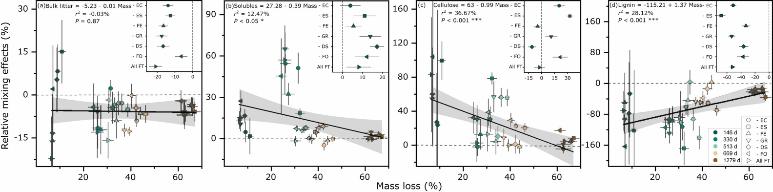 天然林生态系统中,不同植物凋落叶以混合的形式存在,通常混合分解速率与单一叶片分解的预期速率不符,这种凋落叶功能多样性对分解的影响至今仍然难以预测。大部分的混合分解试验仅仅关注凋落叶总的质量损失,针对不同碳组分对凋落叶多样性效应了解很少。我们假设凋落物混合物的分解速度比单独分解速度更快,这是由于可溶性碳组分而非顽固性碳组分的变化驱动的,凋落物碳组分的混合效应与不同凋落物的特征差异有关。