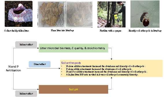 氮沉降引起的生态系统氮/磷比值的升高正以前所未有的速度改变着陆地生态系统凋落叶分解和生物多样性。土壤节肢动物对土壤养分敏感,因此氮和磷水平的波动可能会改变土壤节肢动物的群落结构和组成。然而,目前八戒体育官网(中国)有限公司磷添加及其与氮的交互作用对森林凋落叶分解过程中土壤节肢动物影响的研究鲜有报道,其响应机理更是知之甚少。研究团队在华西雨屏区进行了野外凋落叶分解袋试验,研究了氮、磷添加对凋落叶分解过程中土壤节肢动物的影响。研究结果表明,磷添加通过改变凋落叶分解过程中MBC含量,纤维素和木质素浓度,土壤pH值以及凋落叶氮/磷比进而反转了氮添加对凋落叶分解过程中土壤节肢动物多样性的负面影响。不仅如此,凋落物氮/磷比与土壤节肢动物多样性呈负相关关系,且单独添加氮处理增加了凋落叶氮/磷比,这意味着如果未来大气氮沉降继续上升,凋落叶分解过程中土壤节肢动物多样性将减少。